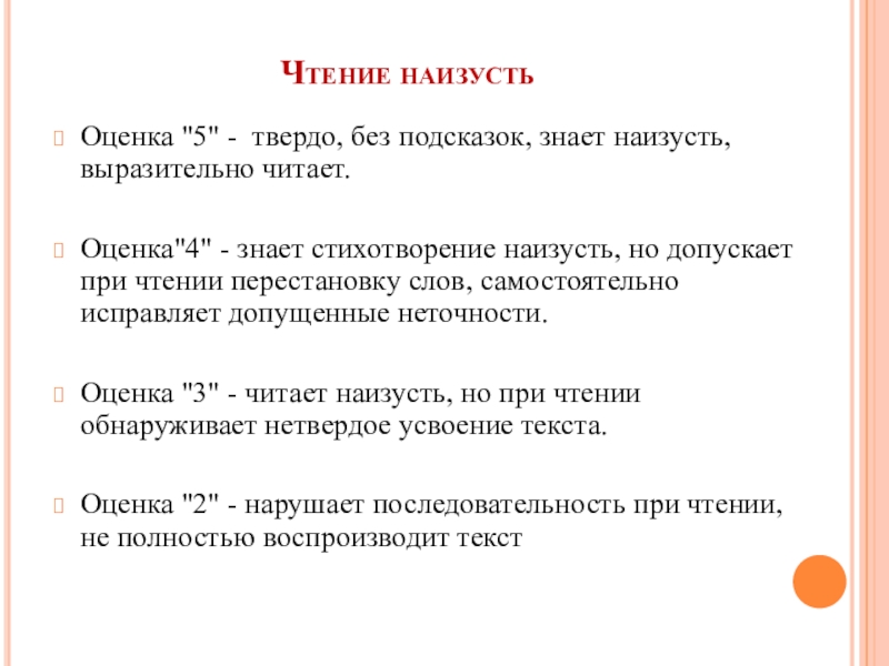 Оценка "5" - твердо, без подсказок, знает наизусть, выразительно читает.