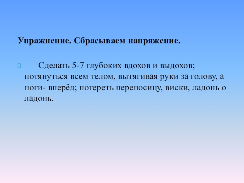 Упражнение. Сбрасываем напряжение.      Сделать 5-7 глубоких вдохов и выдохов; потянуться всем телом, вытягивая руки за голову,