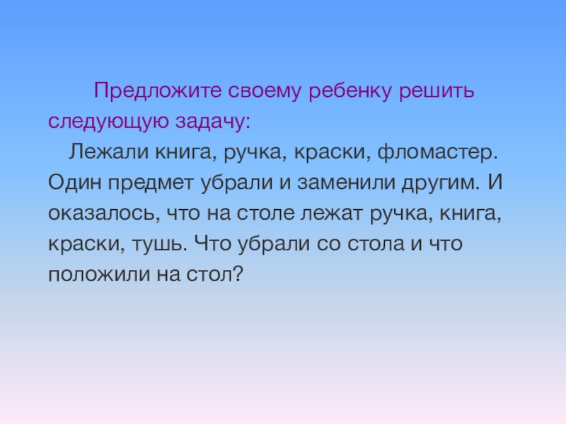 Предложите своему ребенку решить следующую задачу:    Лежали книга, ручка, краски, фломастер. Один предмет убрали и заменили