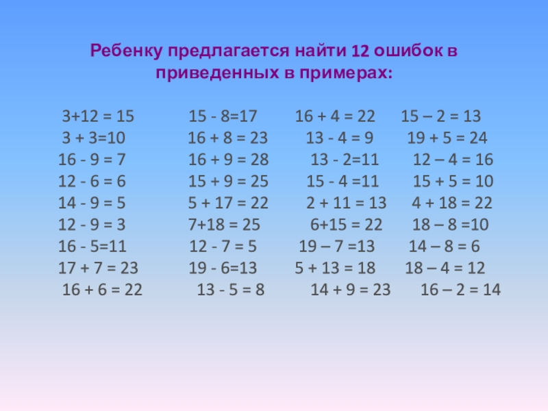 Ребенку предлагается найти 12 ошибок в приведенных в примерах:        3+12 = 15             15 - 8=17         16 + 4 = 22      15