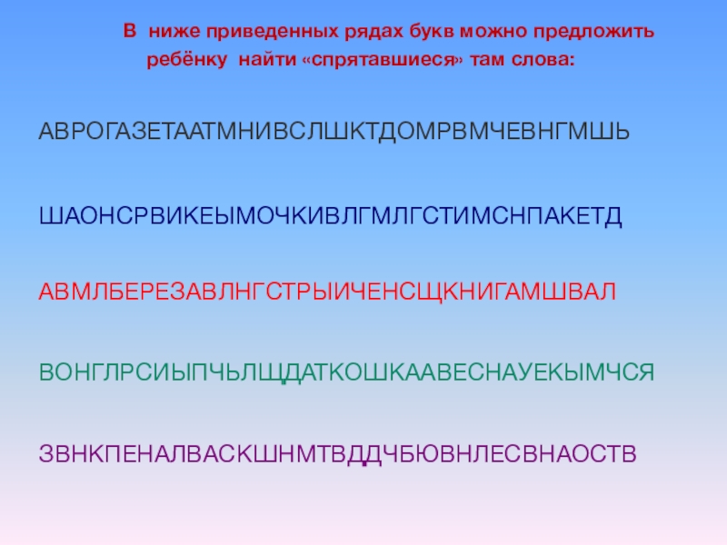 В  ниже приведенных рядах букв можно предложить ребёнку  найти «спрятавшиеся» там слова:АВРОГАЗЕТААТМНИВСЛШКТДОМРВМЧЕВНГМШЬ         ШАОНСРВИКЕЫМОЧКИВЛГМЛГСТИМСНПАКЕТД                 АВМЛБЕРЕЗАВЛНГСТРЫИЧЕНСЩКНИГАМШВАЛ                    ВОНГЛРСИЫПЧЬЛЩДАТКОШКААВЕСНАУЕКЫМЧСЯ            ЗВНКПЕНАЛВАСКШНМТВДДЧБЮВНЛЕСВНАОСТВ