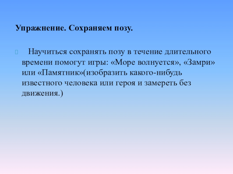 Упражнение. Сохраняем позу.    Научиться сохранять позу в течение длительного времени помогут игры: «Море волнуется», «Замри» или