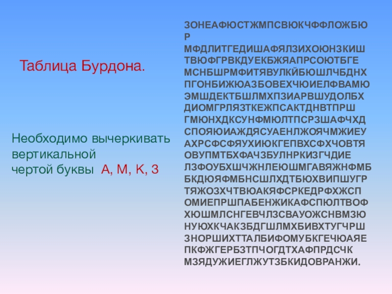 ЗОНЕАФЮСТЖМПСВЮКЧФФЛОЖБЮРМФДЛИТГЕДИШАФЯЛЗИХОЮНЗКИШТВЮФГРВКДУЕКБЖЯАПРСОЮТБГЕМСНБШРМФИТЯВУЛКЙБЮШЛЧБДНХПГОНБИЖЮАЗБОВЕХЧЮИЕЛФВАМЮЭМШДЕКТБШЛМХПЗИАРВШУДОЛБХДИОМГРЛЯЗТКЕЖПСАКТДНВТПРШГМЮНХДКСУНФМЮЛТПСРЗШАФЧХДСПОЯЮИАЖДЯСУАЕНЛЖОЯЧМЖИЕУАХРСФСФЯУХИЮКГЕПВХСФХЧОВТЯОВУПМТБХФАЧЗБУЛНРКИЗГЧДИЕЛЗФОУБХШЧЖНЛЕЮШМГАВЯЖНФМББКДЮЯФМБНСШЛХДТБЮХВИПШУГРТЯЖОЗХЧТВЮАКЯФСРКЕДРФХЖСПОМИЕПРШПАБЕНЖИКАФСПЮЛТВОФХЮШМЛСНГЕВЧЛЗСВАУОЖСНВМЗЮНУЮХКЧАКЗБДГШЛМХБИВХТУГЧРШЗНОРШИХТТАЛБИФОМУБКГЕЧЮАЯЕПКФЖГЕРБЗТПЧОГДТХАФПРДСЧКМЗЯДУЖИЕГЛЖУТЗБКИДОВРАНЖИ. Необходимо вычеркивать вертикальной чертой буквы А, М, К, 3Таблица Бурдона.