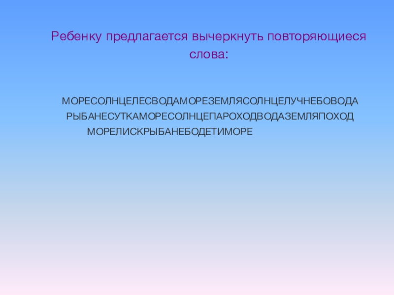 Ребенку предлагается вычеркнуть повторяющиеся слова: МОРЕСОЛНЦЕЛЕСВОДАМОРЕЗЕМЛЯСОЛНЦЕЛУЧНЕБОВОДА     РЫБАНЕСУТКАМОРЕСОЛНЦЕПАРОХОДВОДАЗЕМЛЯПОХОД                  МОРЕЛИСКРЫБАНЕБОДЕТИМОРЕ