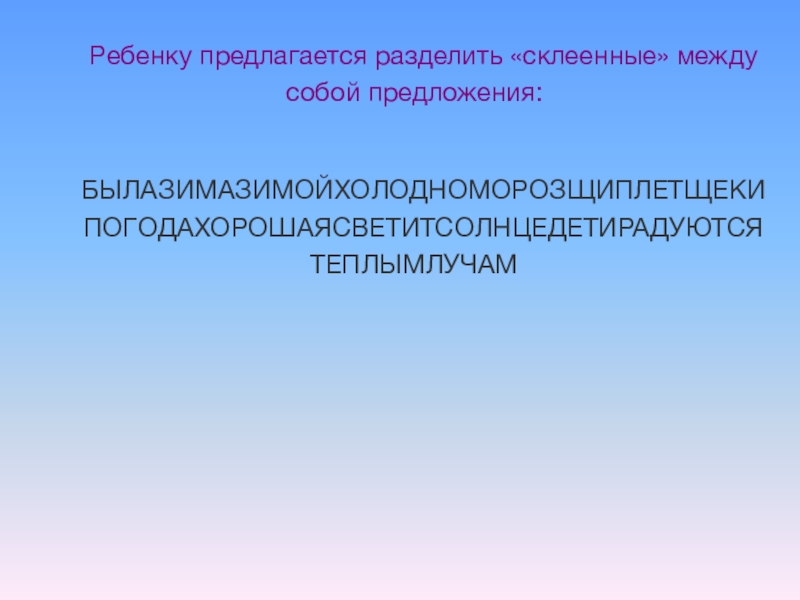 Ребенку предлагается разделить «склеенные» между собой предложения:БЫЛАЗИМАЗИМОЙХОЛОДНОМОРОЗЩИПЛЕТЩЕКИПОГОДАХОРОШАЯСВЕТИТСОЛНЦЕДЕТИРАДУЮТСЯТЕПЛЫМЛУЧАМ