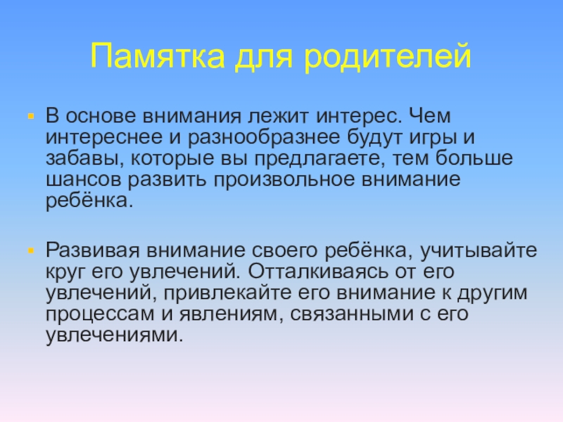Памятка для родителейВ основе внимания лежит интерес. Чем интереснее и разнообразнее будут игры и забавы, которые вы