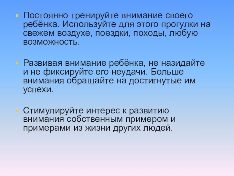 Слайд 12Постоянно тренируйте внимание своего ребёнка. Используйте для этого прогулки на свежем