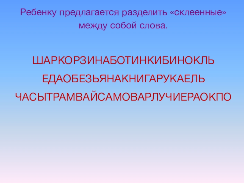 Ребенку предлагается разделить «склеенные» между собой слова.ШАРКОРЗИНАБОТИНКИБИНОКЛЬЕДАОБЕЗЬЯНАКНИГАРУКАЕЛЬЧАСЫТРАМВАЙСАМОВАРЛУЧИЕРАОКПО