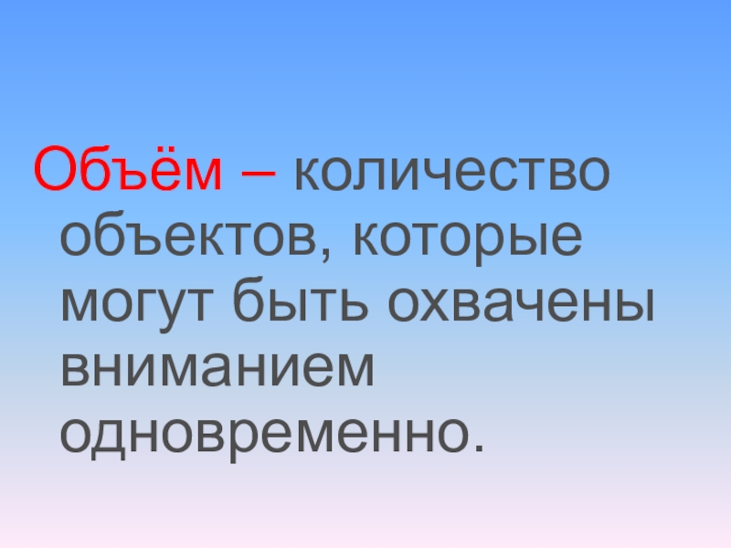 Слайд 6Объём – количество объектов, которые могут быть охвачены вниманием одновременно.