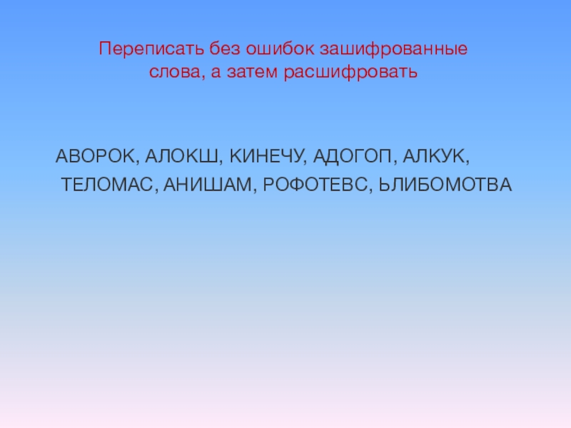 АВОРОК, АЛОКШ, КИНЕЧУ, АДОГОП, АЛКУК, ТЕЛОМАС, АНИШАМ, РОФОТЕВС, ЬЛИБОМОТВАПереписать без ошибок зашифрованные слова, а затем рас­шифровать