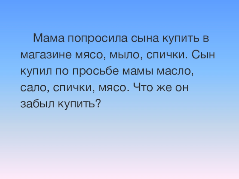 Слайд 27 Мама попросила сына купить в магазине мясо, мыло,