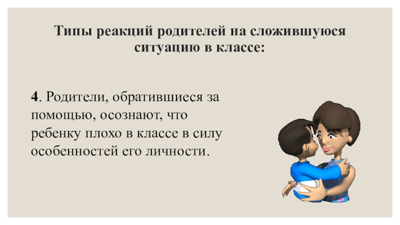 Типы реакций родителей на сложившуюся ситуацию в классе: 4. Родители, обратившиеся за помощью, осознают, что ребенку плохо