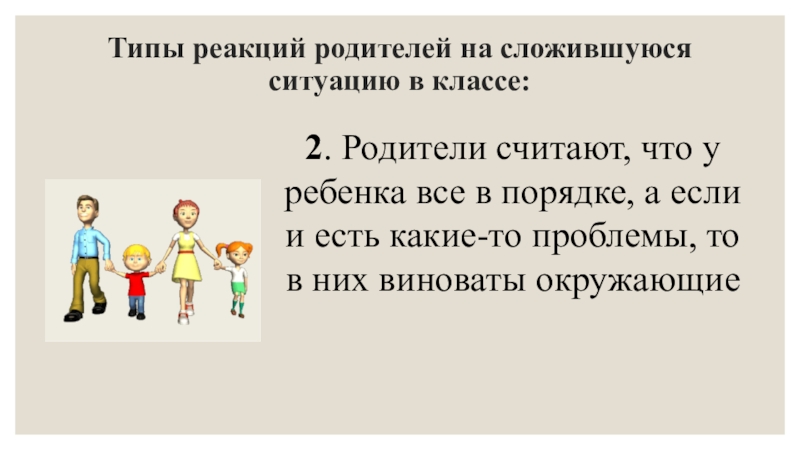 Типы реакций родителей на сложившуюся ситуацию в классе: 2. Родители считают, что у ребенка все в порядке,