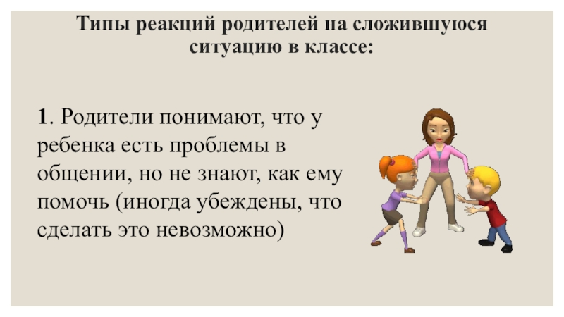 Типы реакций родителей на сложившуюся ситуацию в классе: 1. Родители понимают, что у ребенка есть проблемы в