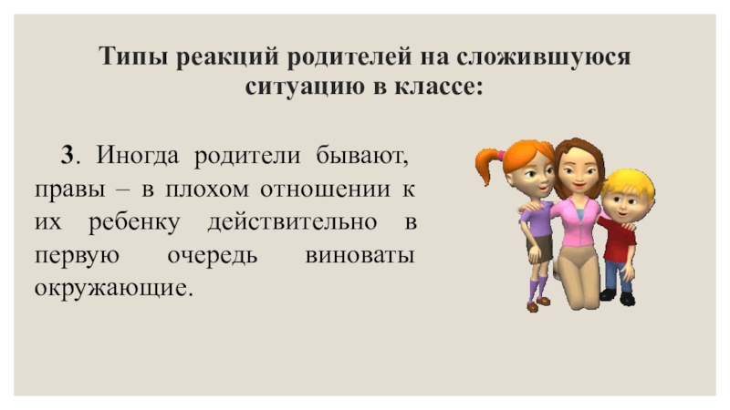 Типы реакций родителей на сложившуюся ситуацию в классе: 3. Иногда родители бывают, правы – в плохом отношении