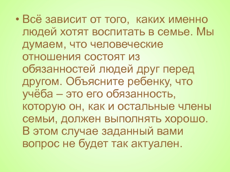 Слайд 30Всё зависит от того, каких именно людей хотят воспитать в семье.