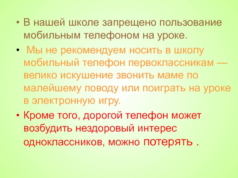 рекомендуем носить в школу мобильный телефон первоклассникам — велико искушение звонить маме по малейшему поводу или поиграть на уроке в электронную игру.