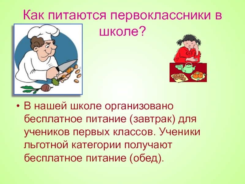 (завтрак) для учеников первых классов. Ученики льготной категории получают бесплатное питание (обед).