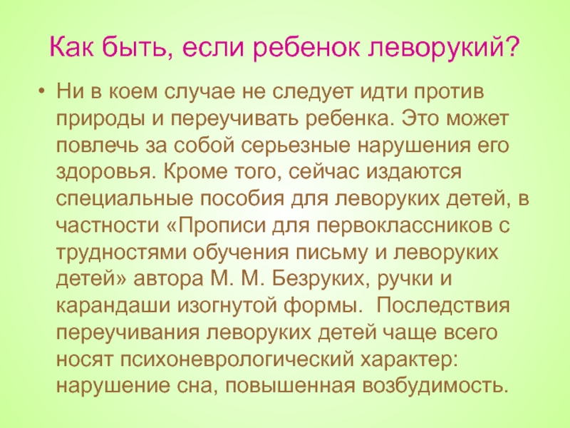 против природы и переучивать ребенка. Это может повлечь за собой серьезные нарушения его здоровья. Кроме того, сейчас издаются специальные пособия для леворуких детей, в частности «Прописи для первоклассников с трудностями обучения письму и леворуких детей» автора М. М. Безруких, ручки и карандаши изогнутой формы. Последствия переучивания леворуких детей чаще всего носят психоневрологический характер: нарушение сна, повышенная возбудимость.