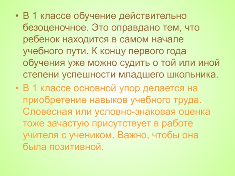 Слайд 28В 1 классе обучение действительно безоценочное. Это оправдано тем, что ребенок