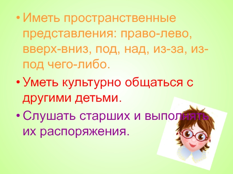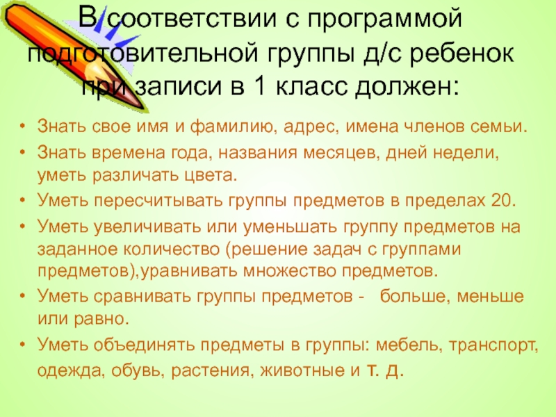 Слайд 13В соответствии с программой подготовительной группы д/с ребенок при записи в