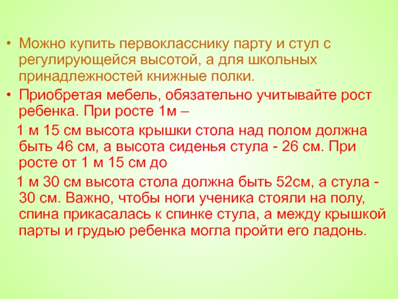 Приобретая мебель, обязательно учитывайте рост ребенка. При росте 1м –