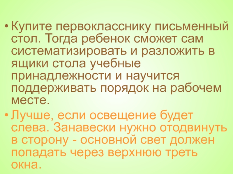 Слайд 35Купите первокласснику письменный стол. Тогда ребенок сможет сам систематизировать и разложить