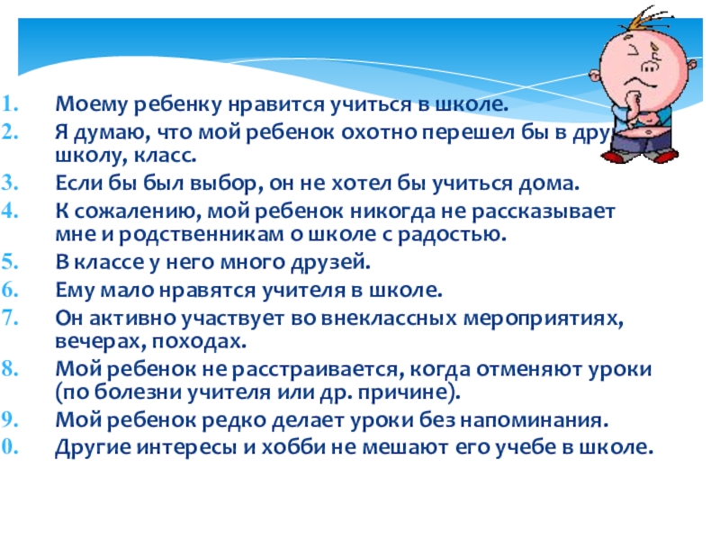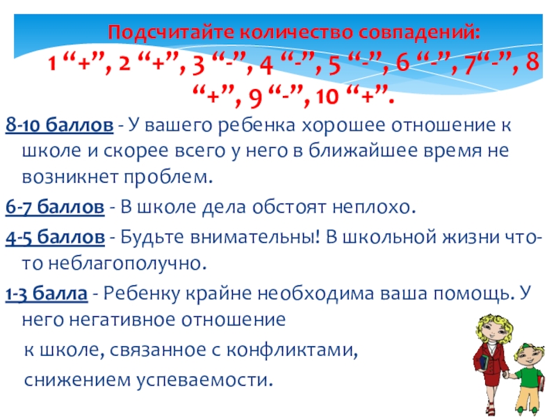 8-10 баллов - У вашего ребенка хорошее отношение к школе и скорее всего у него в ближайшее время не возникнет проблем.
