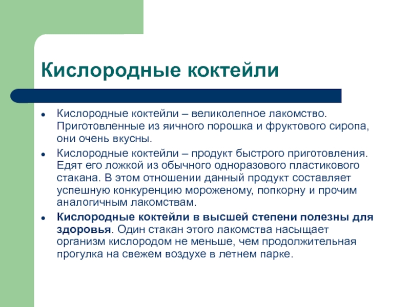 Кислородные коктейли в высшей степени полезны для здоровья. Один стакан этого лакомства насыщает организм кислородом не меньше, чем продолжительная прогулка на свежем воздухе в летнем парке.