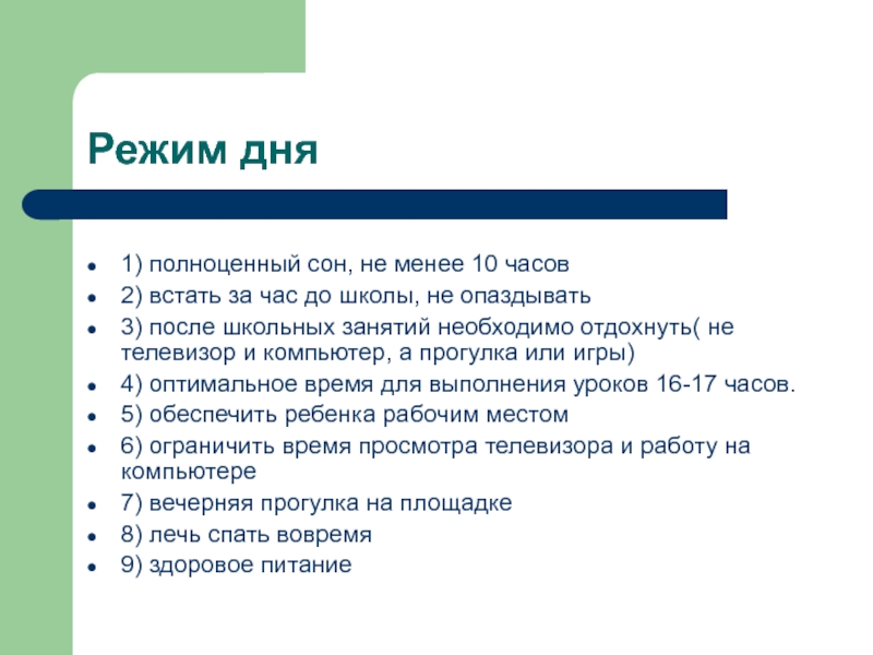 3) после школьных занятий необходимо отдохнуть( не телевизор и компьютер, а прогулка или игры)