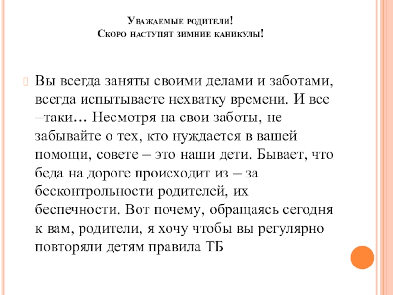 всегда испытываете нехватку времени. И все –таки… Несмотря на свои заботы, не забывайте о тех, кто нуждается в вашей помощи, совете – это наши дети. Бывает, что беда на дороге происходит из – за бесконтрольности родителей, их беспечности. Вот почему, обращаясь сегодня к вам, родители, я хочу чтобы вы регулярно повторяли детям правила ТБ