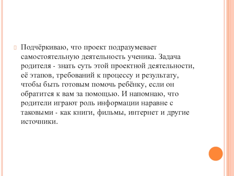 Подчёркиваю, что проект подразумевает самостоятельную деятельность ученика. Задача родителя - знать