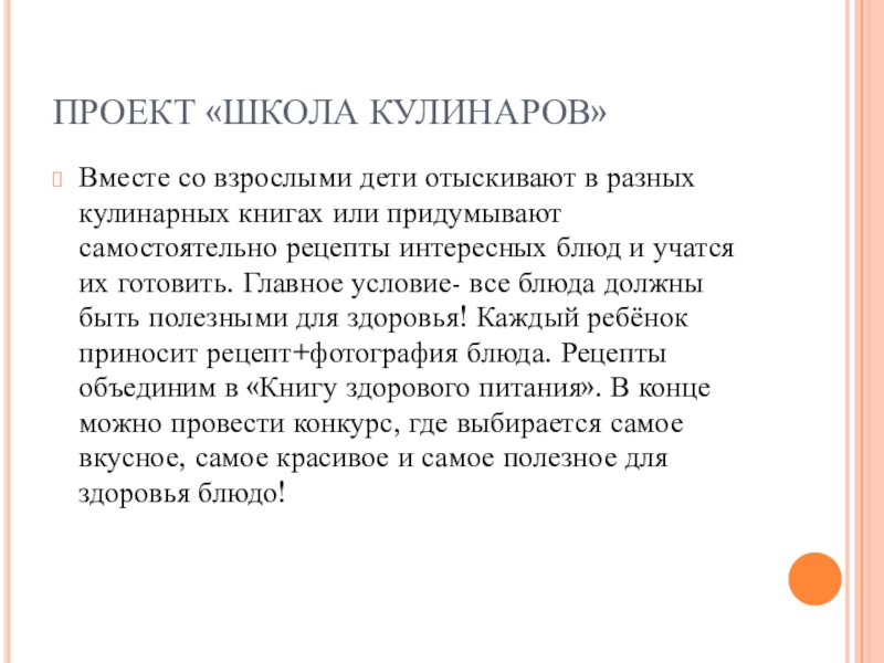 Слайд 10ПРОЕКТ «ШКОЛА КУЛИНАРОВ»