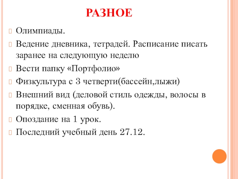 Ведение дневника, тетрадей. Расписание писать заранее на следующую неделю