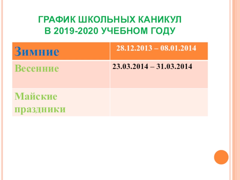 Слайд 14ГРАФИК ШКОЛЬНЫХ КАНИКУЛ