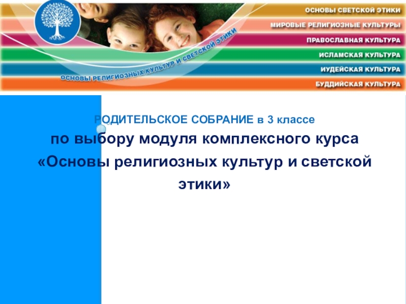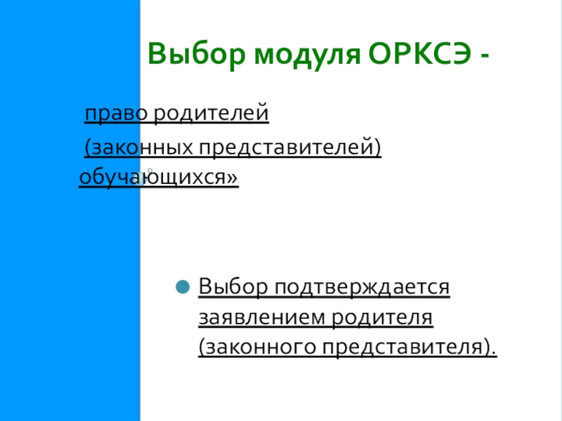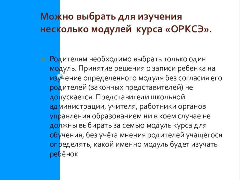 один модуль. Принятие решения о записи ребенка на изучение определенного модуля без согласия его родителей (законных представителей) не допускается. Представители школьной администрации, учителя, работники органов управления образованием ни в коем случае не должны выбирать за семью модуль курса для обучения, без учёта мнения родителей учащегося определять, какой именно модуль будет изучать ребёнок
