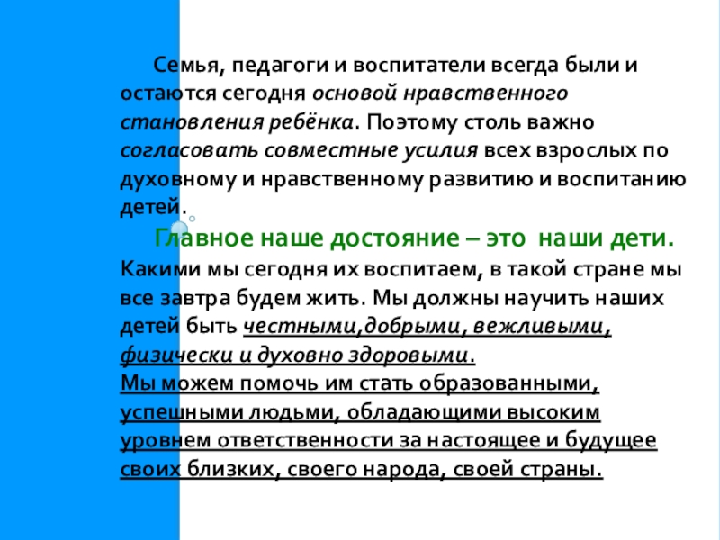 Главное наше достояние – это наши дети. Какими мы сегодня их воспитаем, в такой стране мы все завтра будем жить. Мы должны научить наших детей быть честными,добрыми, вежливыми, физически и духовно здоровыми.