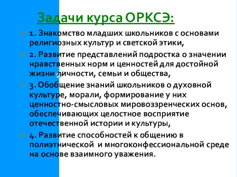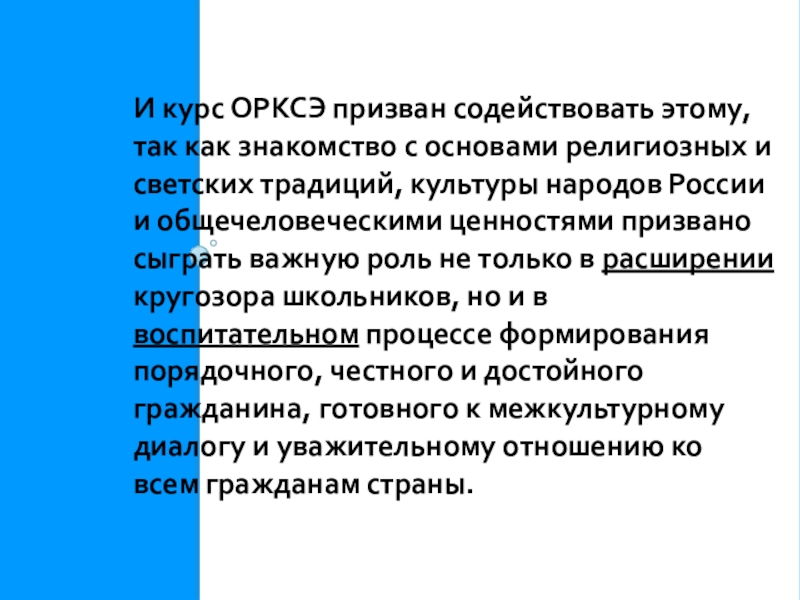 религиозных и светских традиций, культуры народов России и общечеловеческими ценностями призвано сыграть важную роль не только в расширении кругозора школьников, но и в воспитательном процессе формирования порядочного, честного и достойного гражданина, готовного к межкультурному диалогу и уважительному отношению ко всем гражданам страны.