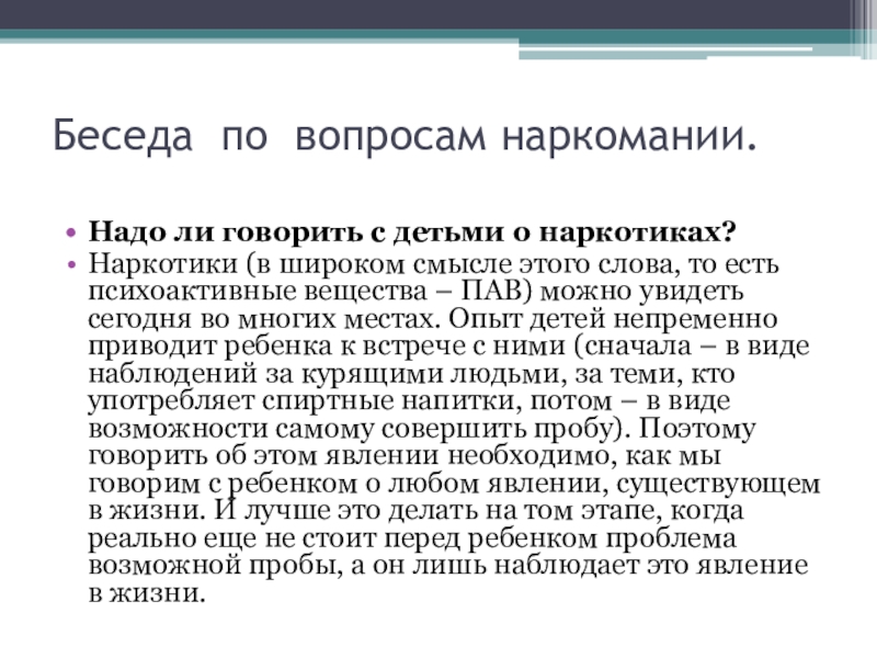 Беседа по вопросам наркомании. Надо ли говорить с детьми о наркотиках?Наркотики (в широком смысле этого слова, то