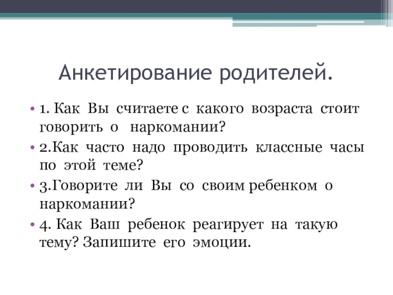 Анкетирование родителей.1. Как Вы считаете с какого возраста стоит говорить о  наркомании?2.Как часто надо проводить классные