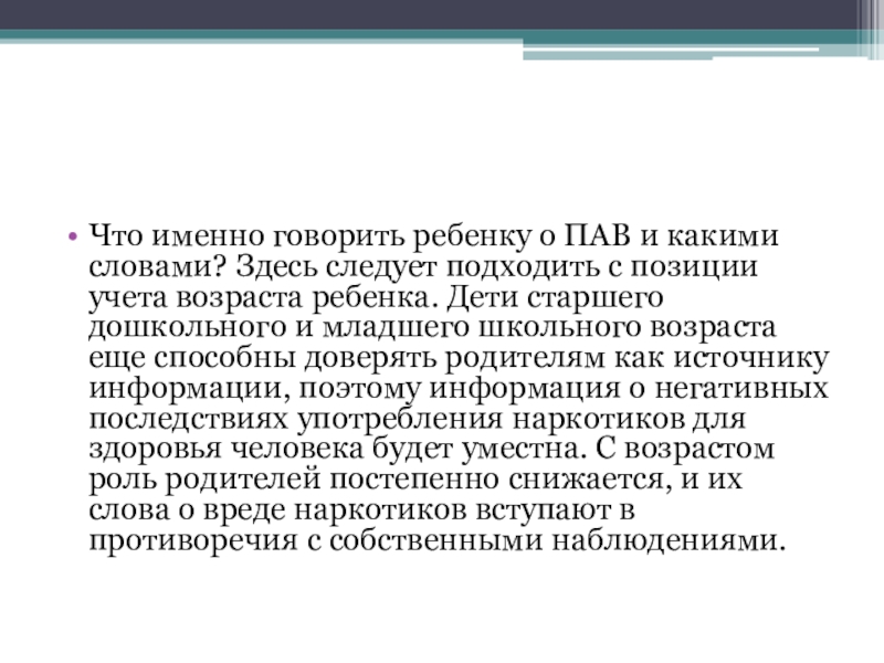 Слайд 5Что именно говорить ребенку о ПАВ и какими словами? Здесь следует