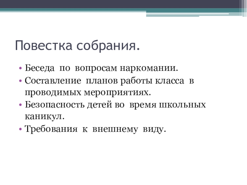 Повестка собрания.Беседа по вопросам наркомании.Составление планов работы класса в проводимых мероприятиях.Безопасность детей во время школьных каникул.Требования к внешнему виду.