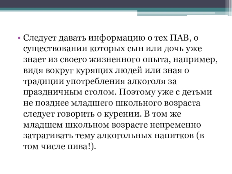 Следует давать информацию о тех ПАВ, о существовании которых сын или дочь уже знает из своего жизненного