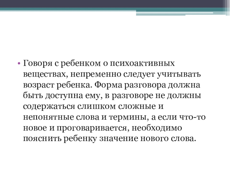 Слайд 6Говоря с ребенком о психоактивных веществах, непременно следует учитывать возраст ребенка.