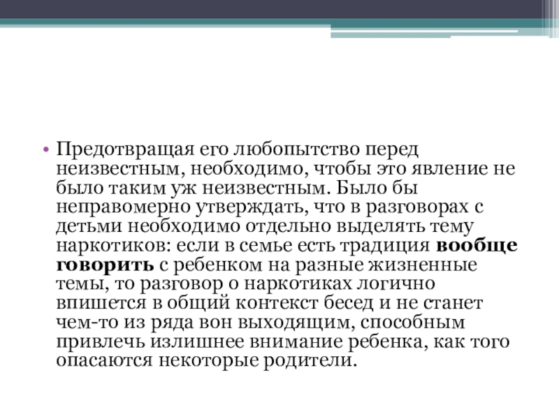 таким уж неизвестным. Было бы неправомерно утверждать, что в разговорах с детьми необходимо отдельно выделять тему наркотиков: если в семье есть традиция вообще говорить с ребенком на разные жизненные темы, то разговор о наркотиках логично впишется в общий контекст бесед и не станет чем-то из ряда вон выходящим, способным привлечь излишнее внимание ребенка, как того опасаются некоторые родители.
