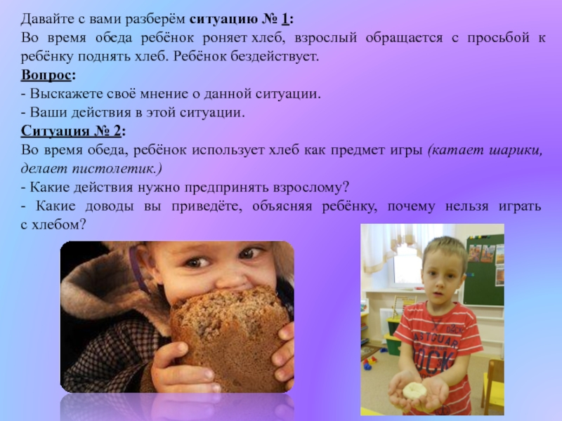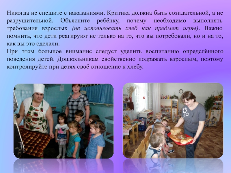 разрушительной. Объясните ребёнку, почему необходимо выполнять требования взрослых (не использовать хлеб как предмет игры). Важно помнить, что дети реагируют не только на то, что вы потребовали, но и на то, как вы это сделали.