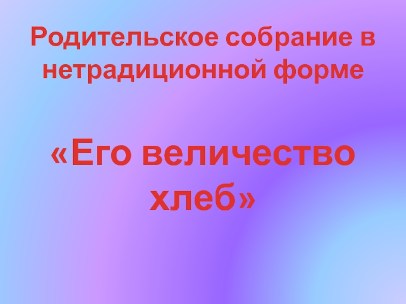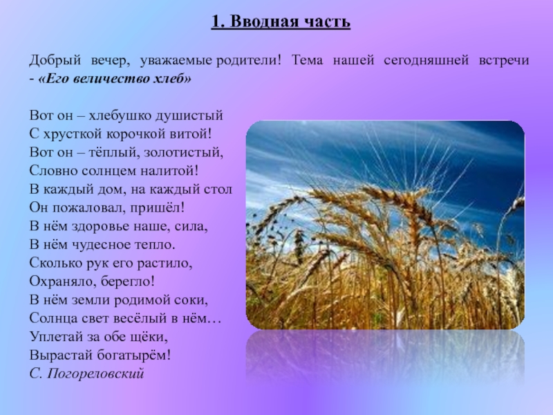 Добрый вечер, уважаемые родители! Тема нашей сегодняшней встречи - «Его величество хлеб»