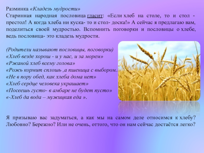 престол! А когда хлеба ни куска- то и стол- доска!» А сейчас я предлагаю вам, поделиться своей мудростью. Вспомнить поговорки и пословицы о хлебе, ведь пословица- это кладезь мудрости.