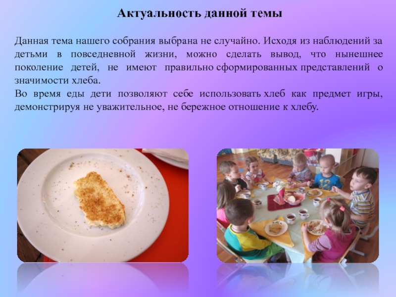 Во время еды дети позволяют себе использовать хлеб как предмет игры, демонстрируя не уважительное, не бережное отношение к хлебу.