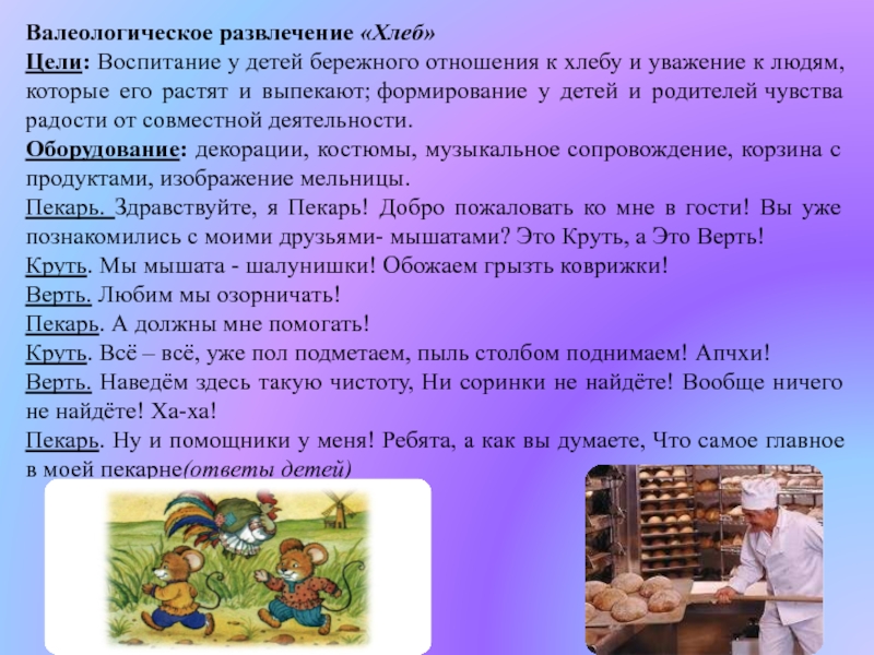 Цели: Воспитание у детей бережного отношения к хлебу и уважение к